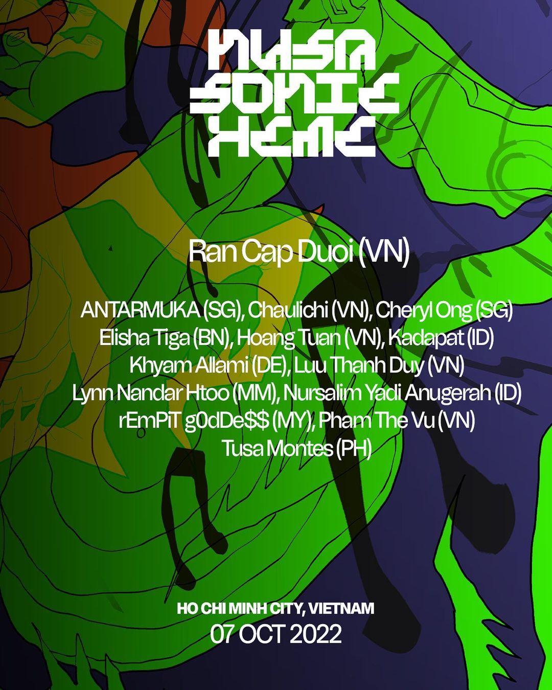 5 – 8 October 2022 After five years of diving into experimental sound and music cultures in Southeast Asia and enabling dialogue within the region and beyond, the last edition of Nusasonic will be in Ho Chi Minh City. This multi-day festival is co-curated by Zach Sch of HCMC-based collective Rắn Cạp Đuôi, and will consist of a public talk, club night, and a workshop leading to a collaborative performance led by Berlin-based musician and researcher Khyam Allami. For more information, please head over here. Sau 5 năm đào sâu vào lĩnh vực âm nhạc thể nghiệm và các nền văn hóa âm nhạc ở Đông Nam Á, tạo điều kiện cho các cuộc đối thoại trong và ngoài khu vực được diễn ra, mùa cuối cùng của Nusasonic sẽ được tổ chức vào tháng 10 này tại Thành phố Hồ Chí Minh. Lễ hội âm nhạc dài ngày Nusasonic được đồng giám tuyển bởi Zach Sch thuộc Rắn Cạp Đuôi - nhóm nhạc thể nghiệm hoạt động tại TP. HCM. Chuỗi chương trình sẽ bao gồm các hoạt động tọa đàm, đêm nhạc clubnight và workshop âm nhạc kết hợp với biểu diễn, dẫn dắt bởi nhạc sĩ, nhà nghiên cứu đến từ Berlin - Khyam Allami. |